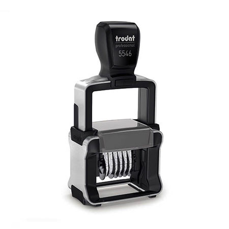 Sello numerador automático con tinta ya incorporada, carcasa metálica, cambio manual mediante ruedas.